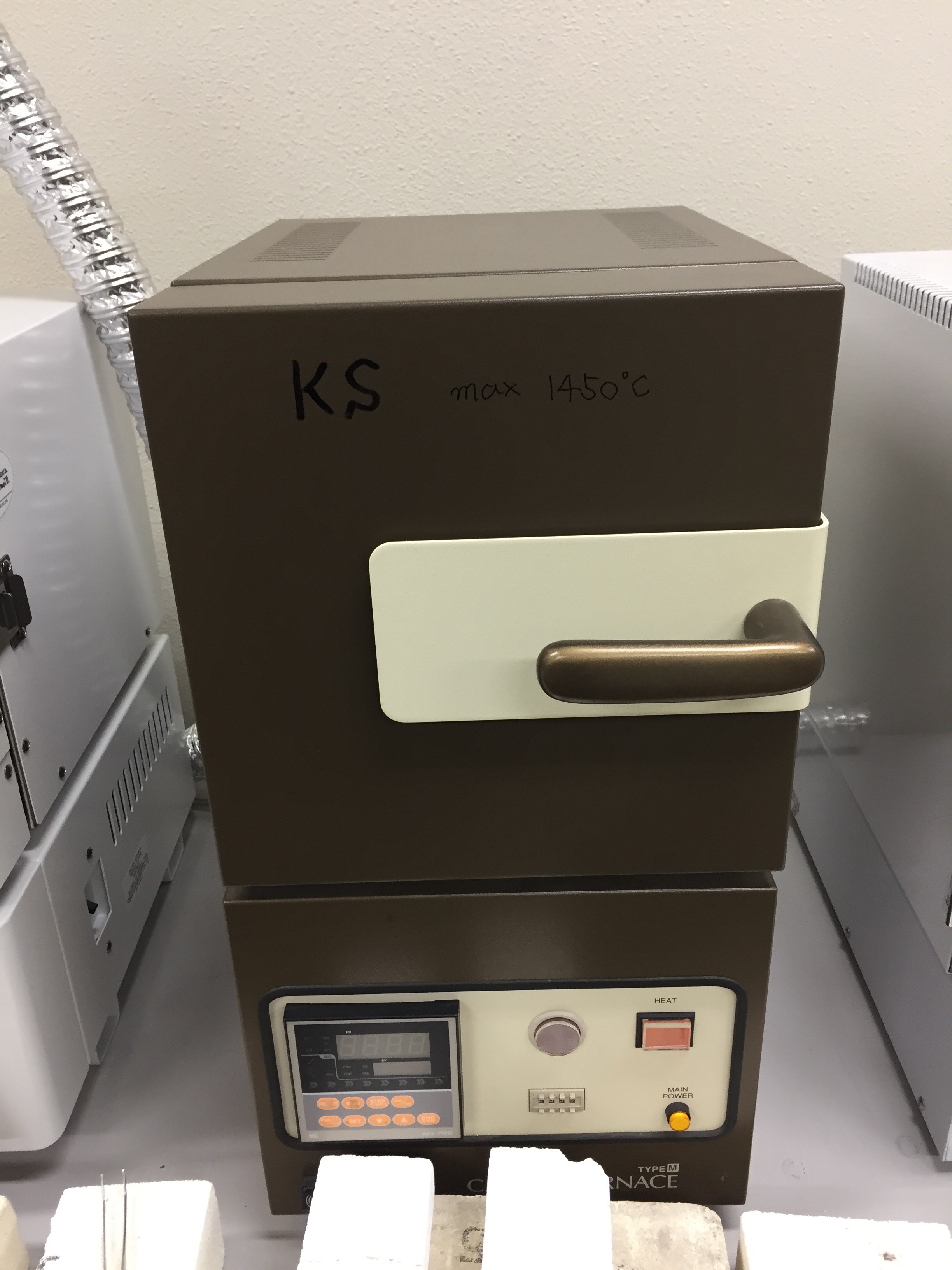 発熱体にカンタルスーパーを使用し,1450℃までの焼成可能な高温用電気炉。スピンアイスのパイロクロア酸化物(Dy2Ti2O7など)の多結晶は,この電気炉で合成されている。