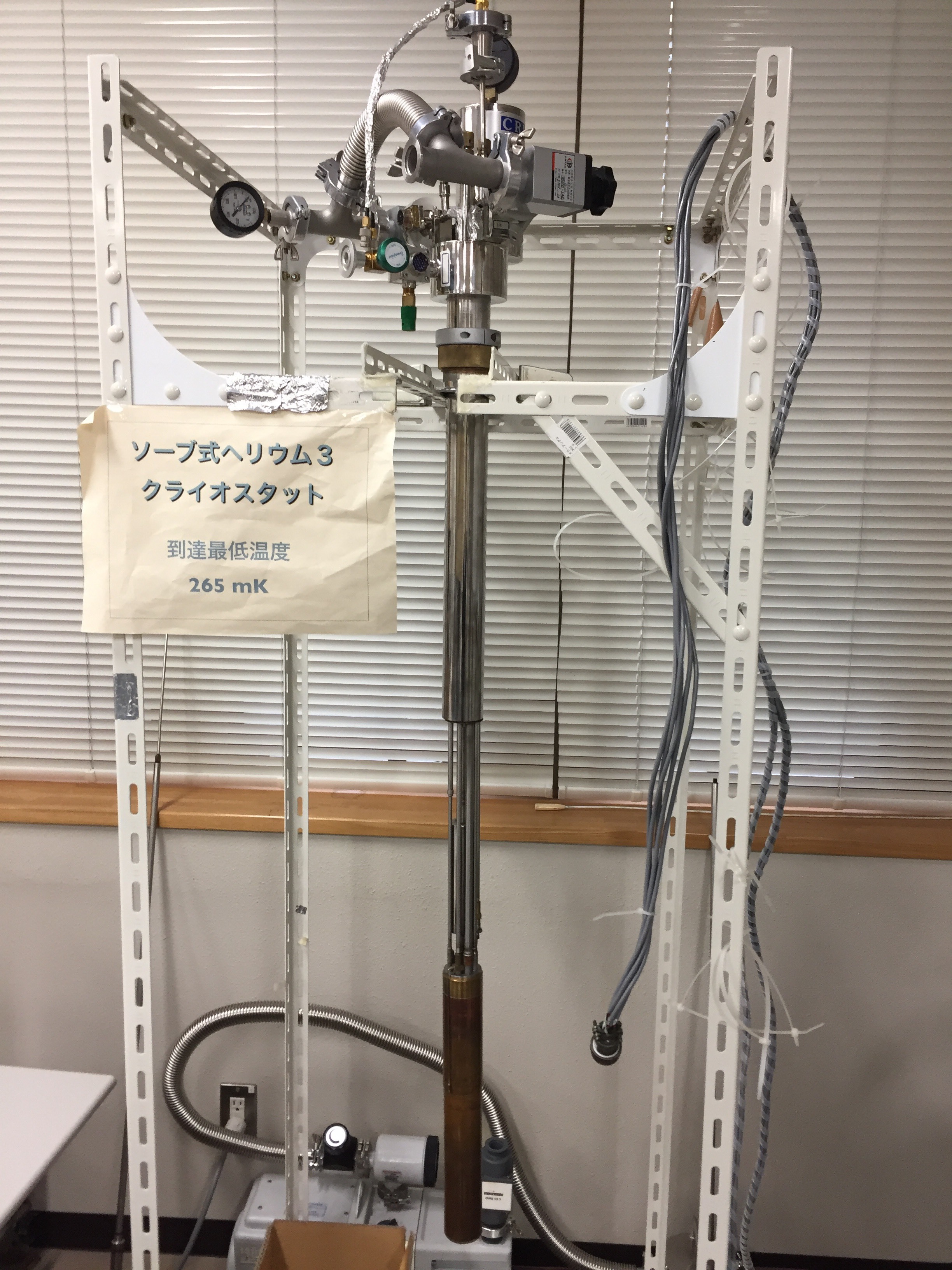 密封されたヘリウム3ガスを,ソーブと呼ばれる気体吸着剤の性質を利用して,ヘリウム3を液化および排気することにより冷却する冷凍機。最低到達温度は0.26K。電気抵抗,比熱測定などが可能。