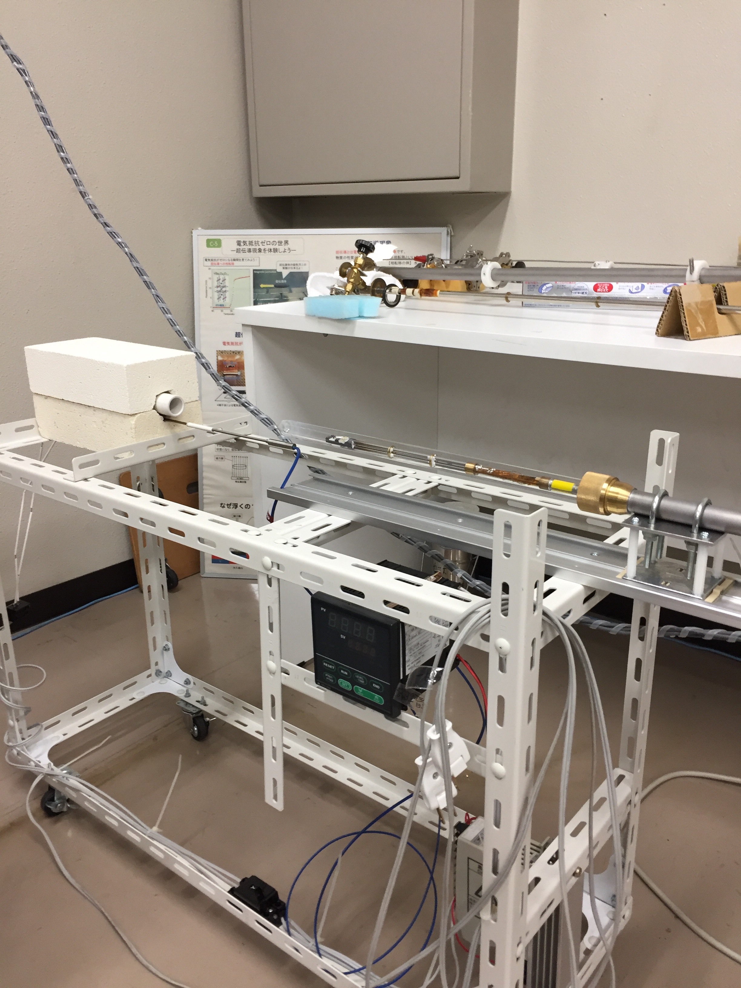 室温から600℃までの電気抵抗と熱電能の測定を行う装置(自作)。2013年度に工藤君が200℃までのプロトタイプを作成し,2016年度に羽根田君が600℃までの高温まで測定できるように改良しました。