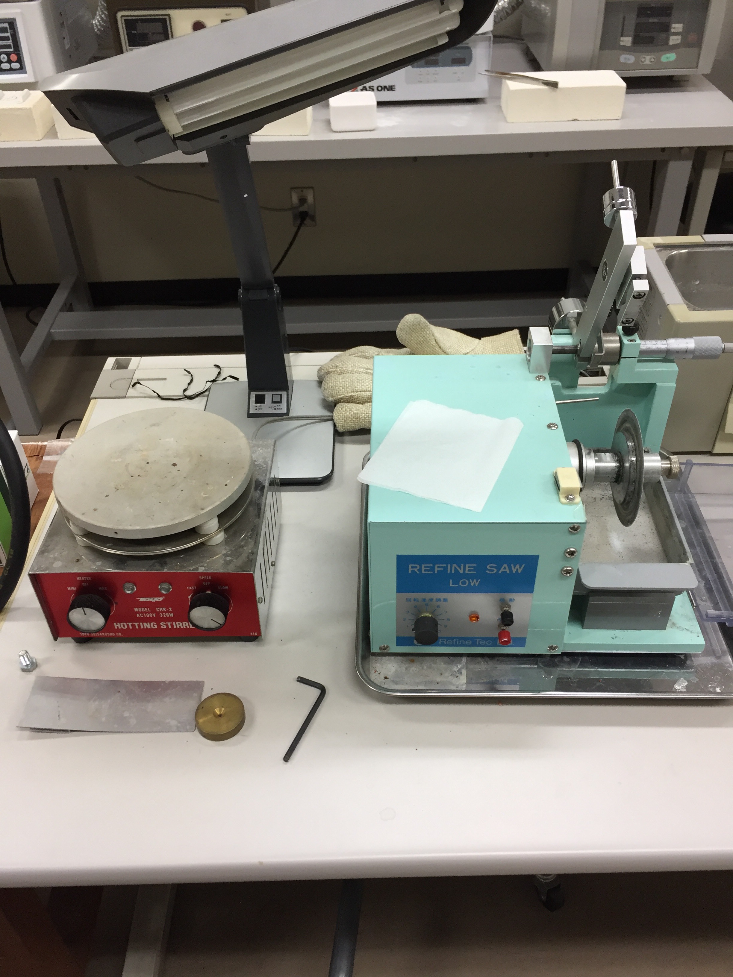 試料などを切断するときに用いる。ホットプレートは試料を加工するさいに,試料を台に熱可塑性接着剤で固定するさいに用いる。無いと困る実験装置。