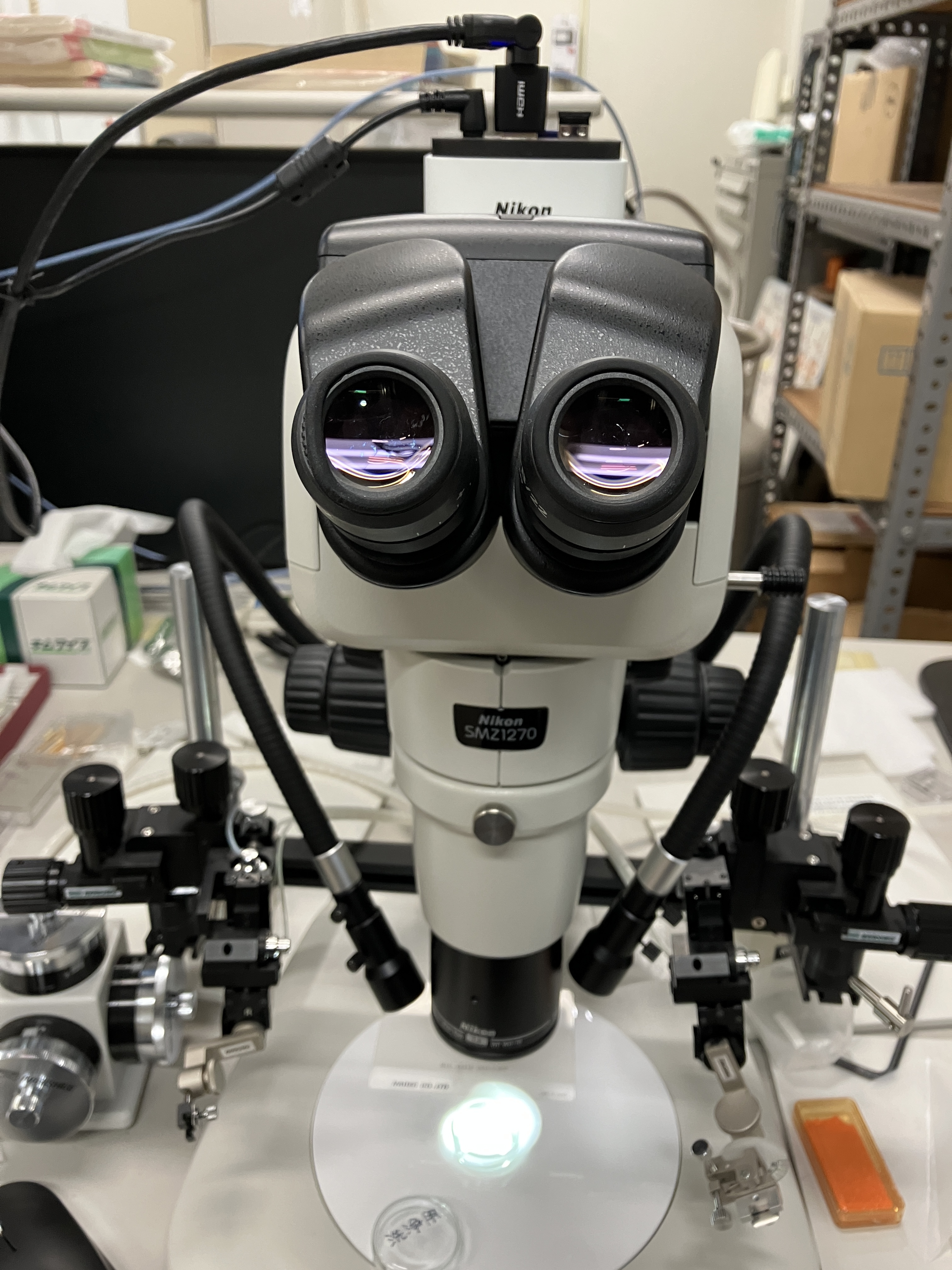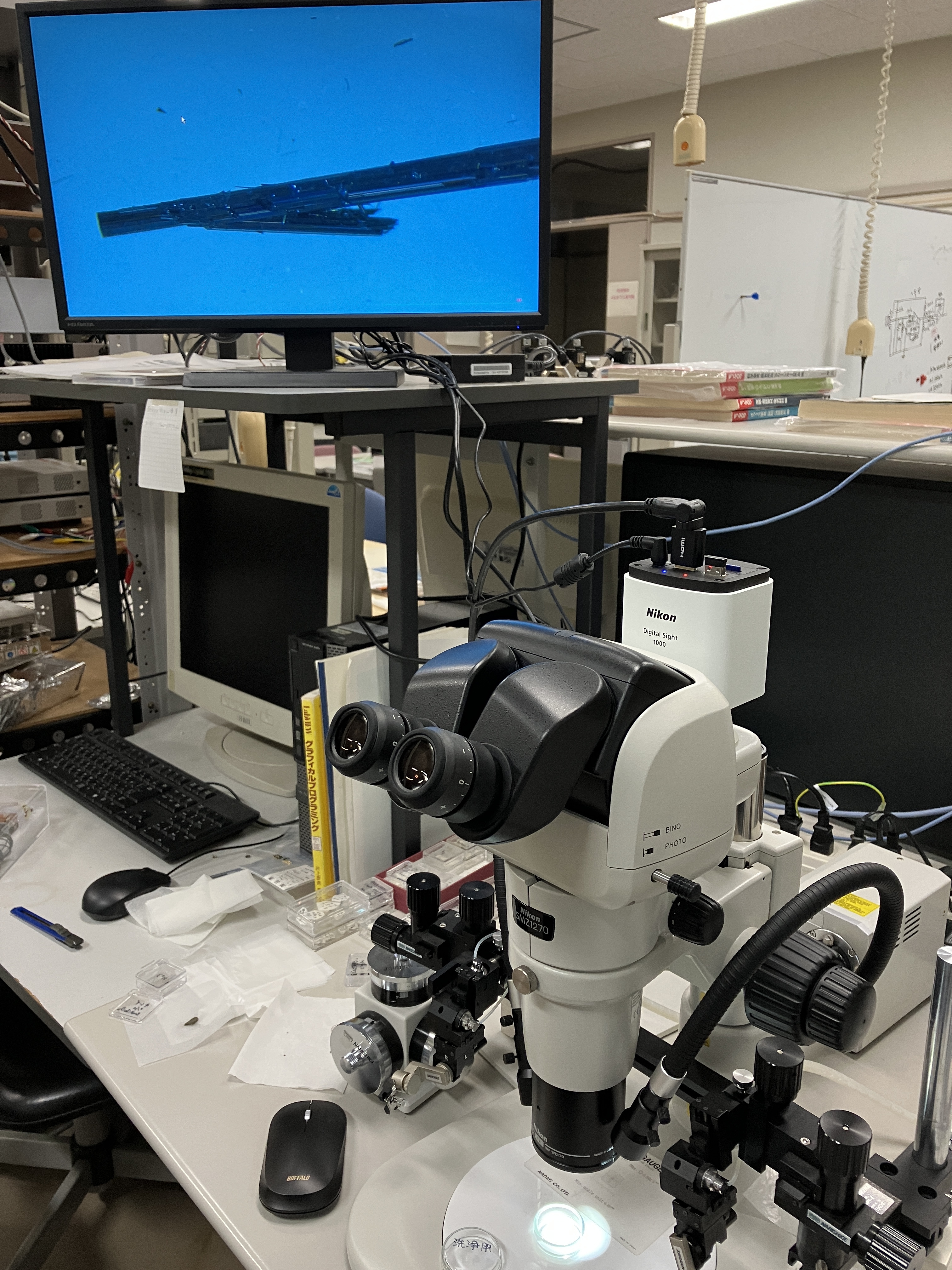 ジョイスティックなどでピンセットを高精度に動作可能にします。微小な単結晶への配線を行う際に用いてます。実体顕微鏡は他に2台あり端子付などで使用されてます。マイクロマニピュレータは2019年度導入