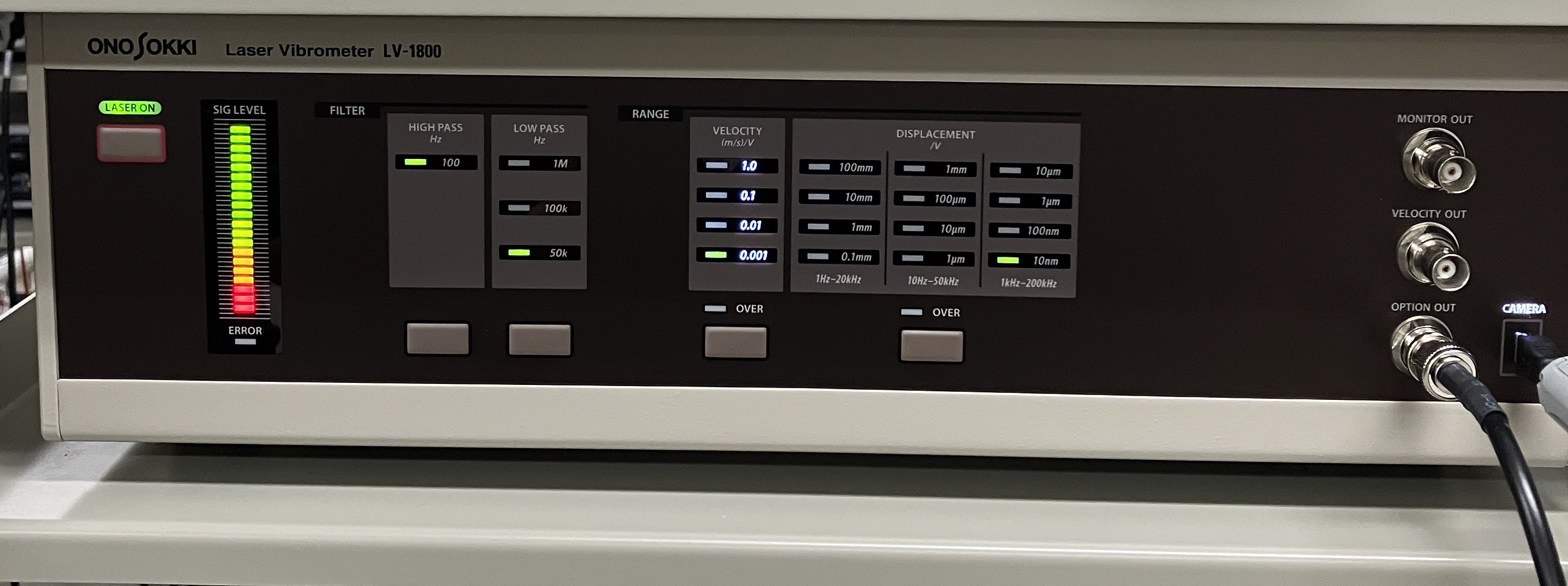 小野測器LV-1800。レーザー光のドップラーシフトを利用して,非接触で振動の速度および振幅(変位)を高精度(~0.01 nm)に検出する装置です。2023年度学術変革領域"アシンメトリ量子"の予算により導入。GM冷凍機と組み合わせてピエゾ効果(圧電効果)が約5Kまでの低温で測定可能。