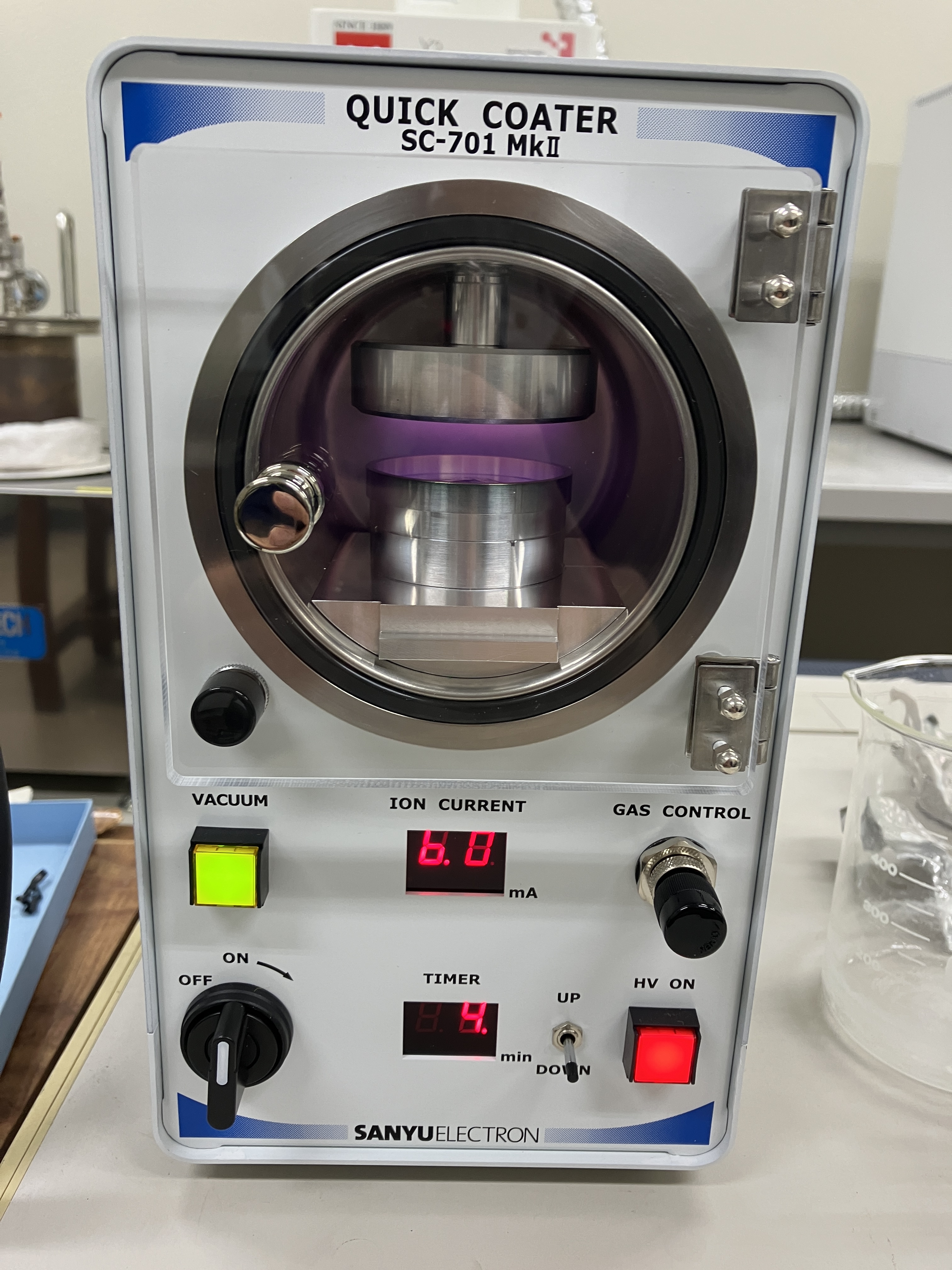 サンユー電子(株)SC-701MkII。非常にコンパクトなコーター。試料の電極形成に用います。2023年度導入